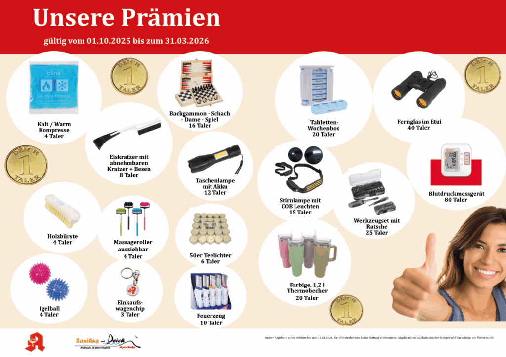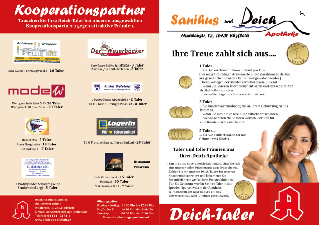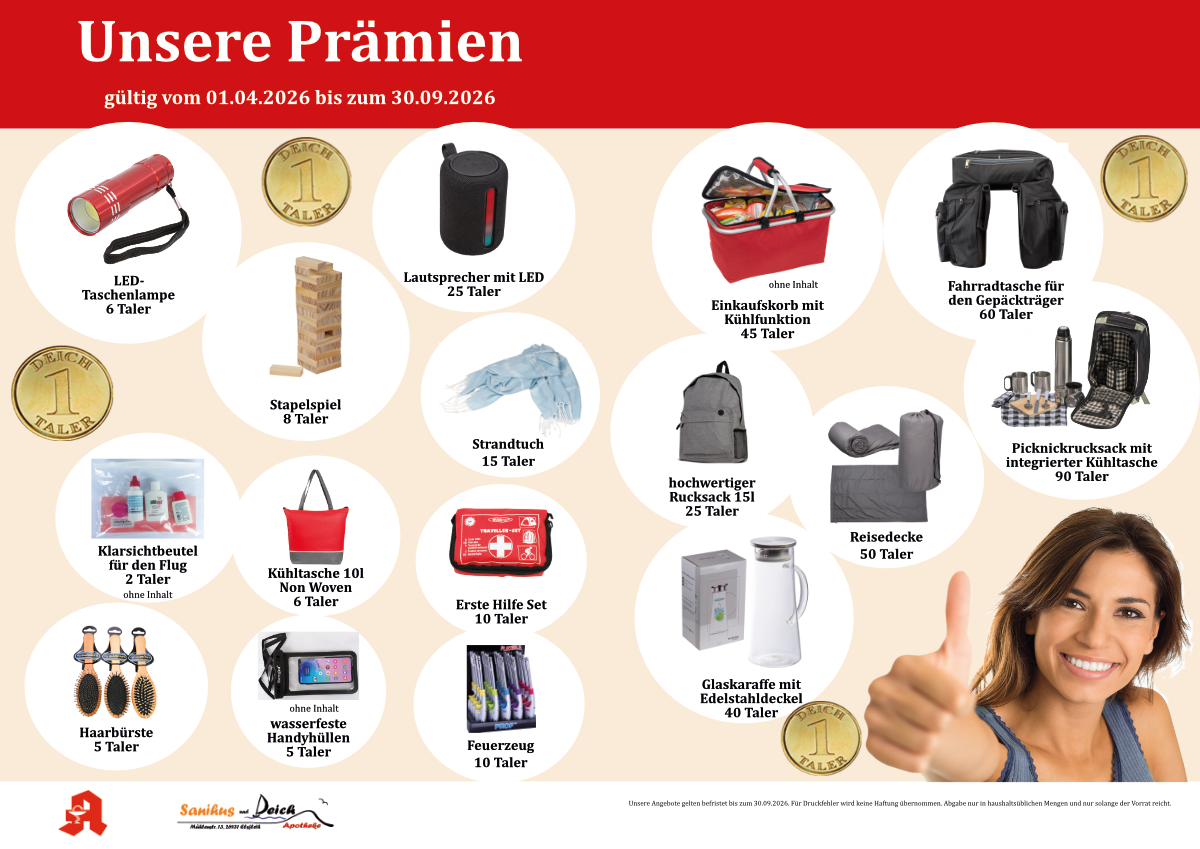 Sammeln Sie Deichtaler und suchen Sie sich eine unserer tollen Prämien aus dem Prospekt aus. Unsere Deich-Taler können Sie auch bei unseren Kooperationspartnern gegen deren attraktive Prämien einlösen.